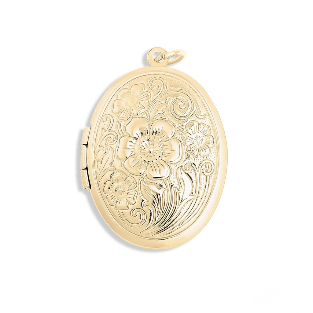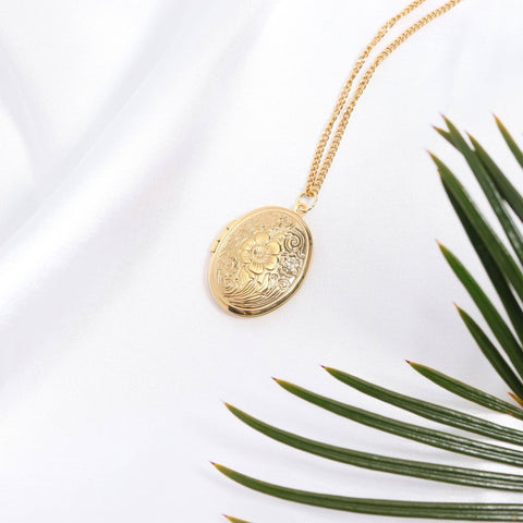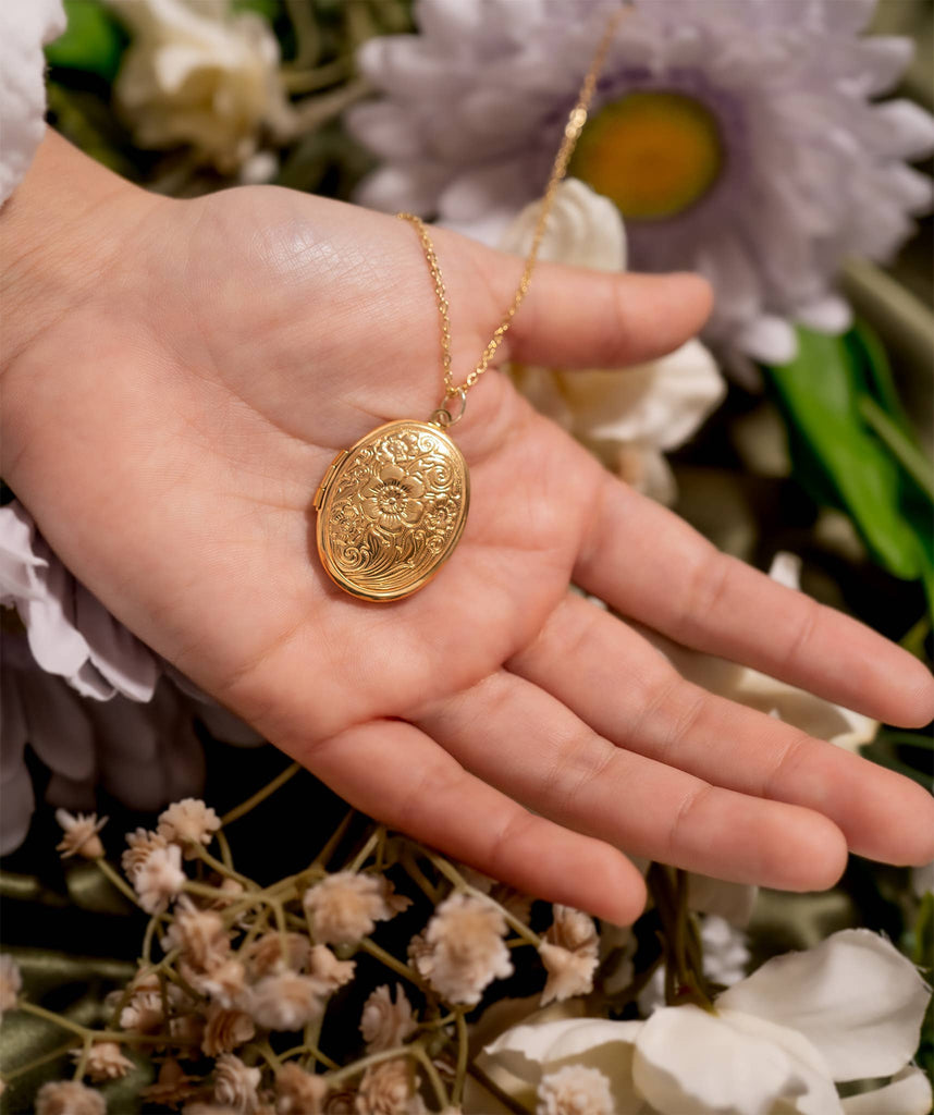 Textured Oval Locket: This elegant textured oval locket combines timeless beauty with modern durability. Featuring a stunning floral texture, the locket adds a delicate, vintage-inspired charm to any jewelry collection. Crafted with high quality stainless steel and finished with a luxurious 18K gold PVD, this piece offers both sophistication and long-lasting wear. Designed to open, the locket features a hidden compartment to keep a treasured photo or keepsake close to your heart. ✦ Waterproof, non-tarnish, hypoallergenic ✦ 18K Gold PVD coated 316L Stainless Steel ✦ Perfect for accenting chain necklaces. The PVD coating process of the 18K gold jewelry over 316L surgical grade stainless steel gives the jewelry a non-tarnish, hypoallergenic, polished finish. This will hold up best to everyday wear and will never turn your skin green. Approx. Dimensions: 33.30 x 23.60 Jump Ring Gauge: 22 - Inner Diameter: 4mm - Outer Diameter: 6mm Approx. Weight: 4.16g
