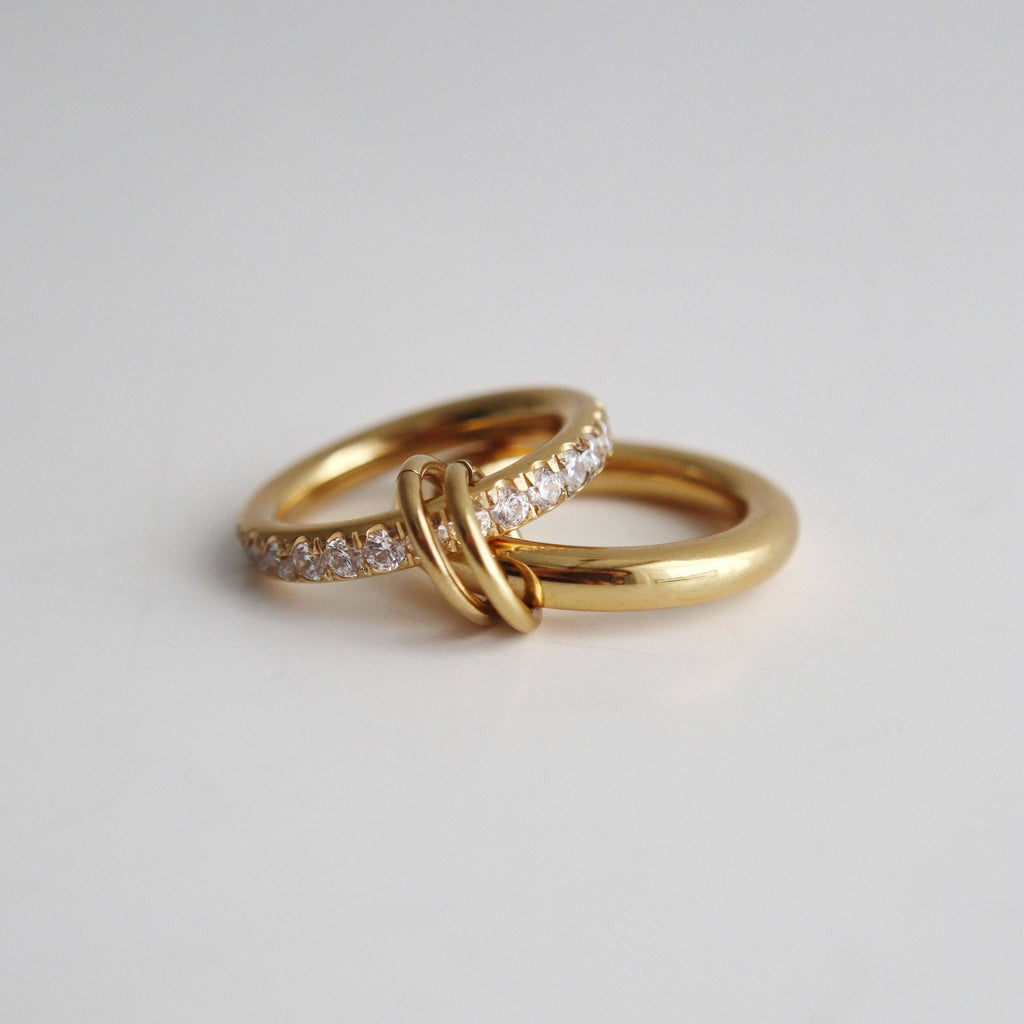 This ring features two linked bands, one band is sleek and smooth while the other is adorned with a row of sparkling cubic zirconia stones. Perfect for making a glamour statement, this piece balances luxury with a contemporary edge, ideal for a night out or special occasions. -stainless steel, gold plated