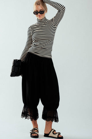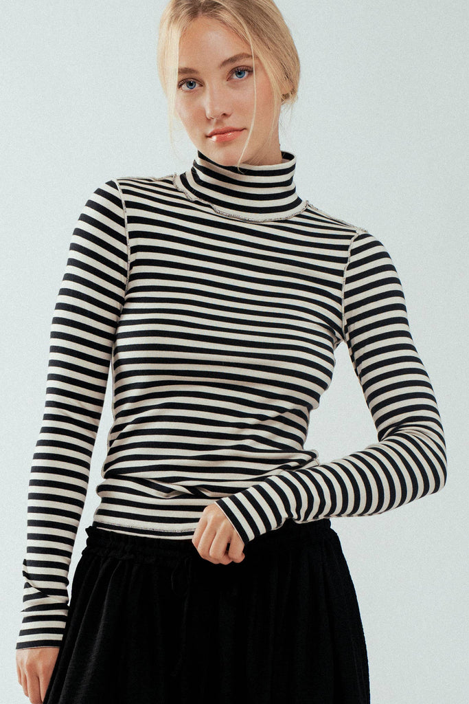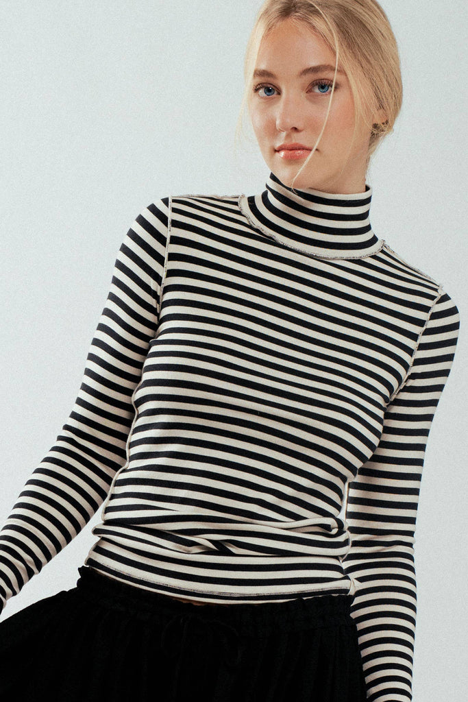 - Features a classic black and white stripe pattern with exposed seam details for a unique touch.
