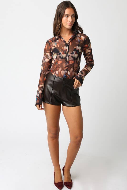 Our mesh blouse features a button down and a sheer material. Woven and sheer.