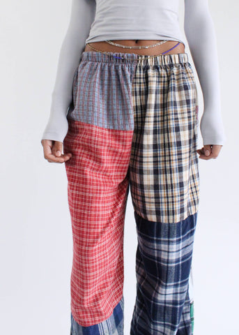 Authentic vintage flannel shirts reworked into an elastic waist pant. These pants include a mix of warm and cool tones and will be similar but not identical to the products shown. Each piece is unique and will come with a one-of-a-kind pattern and color combinations. All waist measurements are measured un-stretched to stretched length lying flat. Length is measured down from the inseam to hem. Rise Mid/ Regular Length 29" -31" SM Waist 25"-31" Hips 37" ML Waist 28"-36" Hips 42"