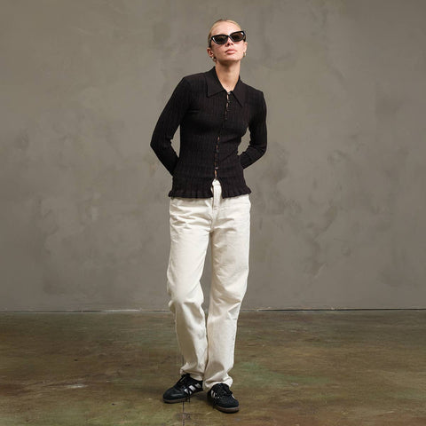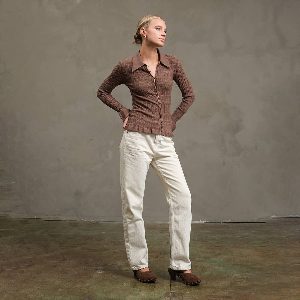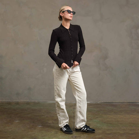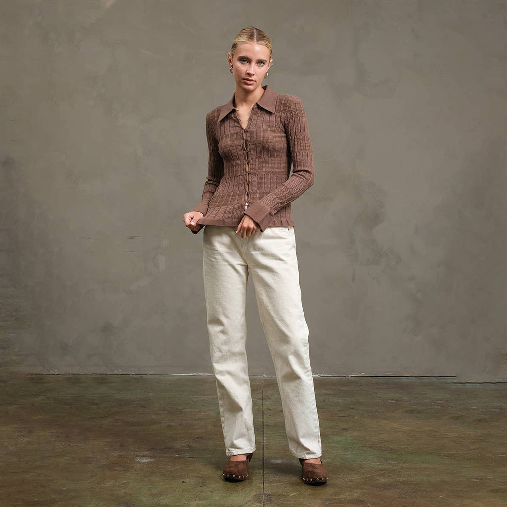 Slim-fit knit cardigan with soft texture, classic collar, and flared cuffs.