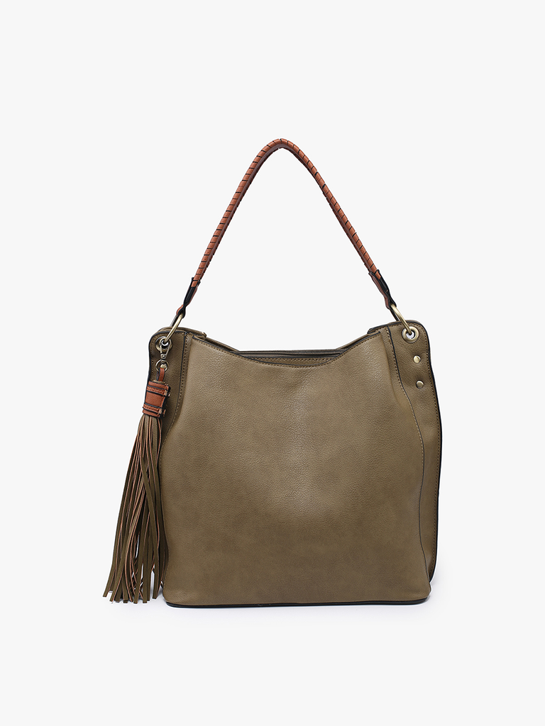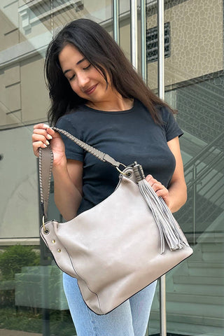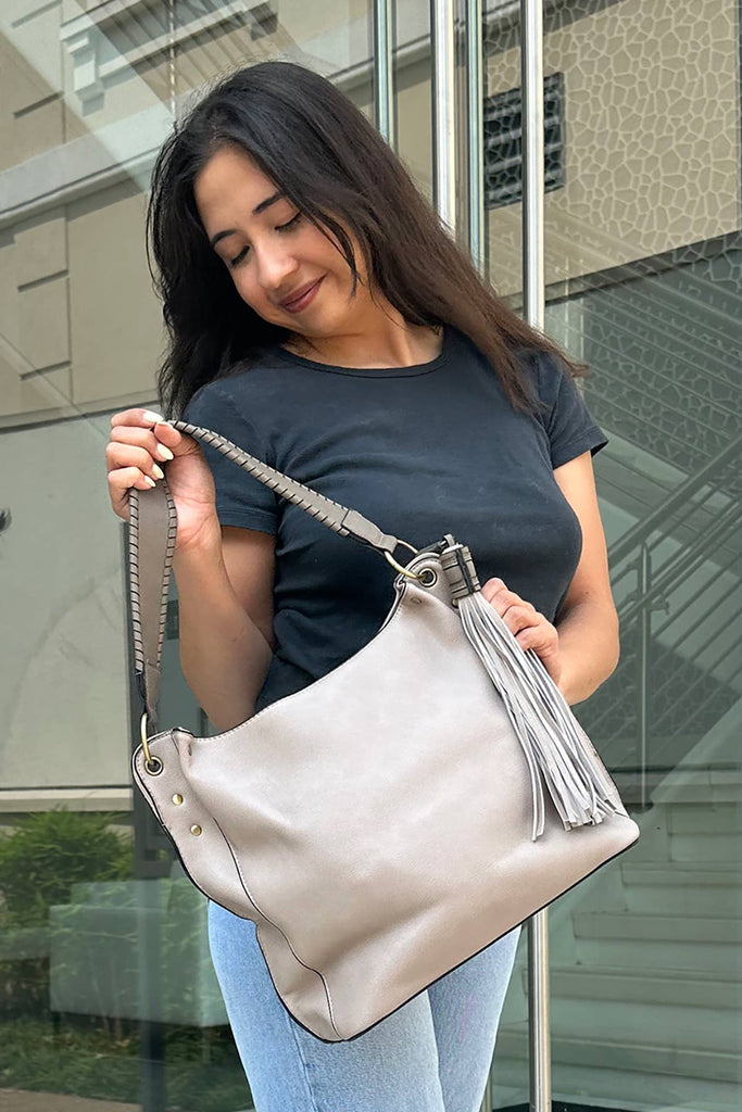Item Details: Three compartment tassel hobo bag -Features: Slouchy hobo bag, decorative side tassel, main zipper closure, herringbone lining, inner zip and slip pockets -Material: Vegan leather Dimensions: -Length: 13 inches -Depth: 5 inches -Height: 11.5 inches. This three compartment tassel hobo bag is a stylish and versatile accessory designed for everyday use. Its slouchy hobo silhouette exudes casual elegance, perfect for effortlessly chic looks. The decorative side tassel adds a touch of bohemian charm to the design.