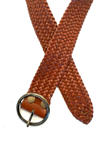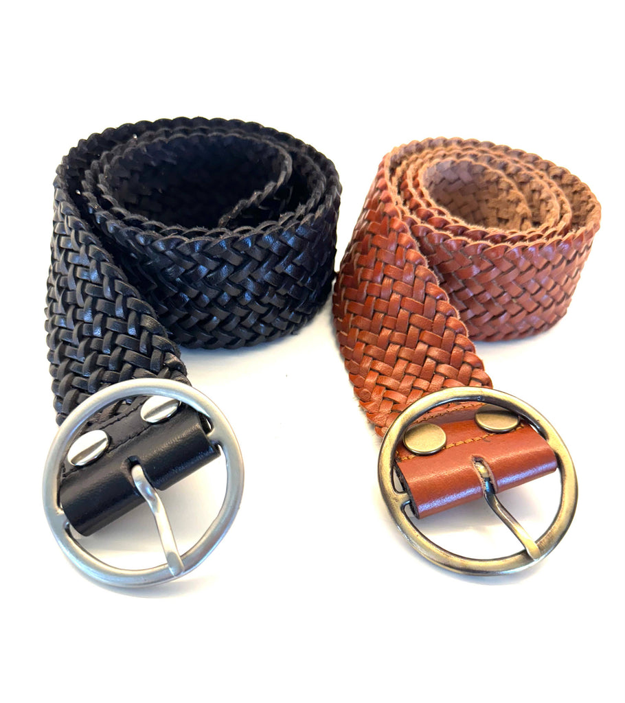 Braided leather belt available in two color-ways, cognac and black. Available in two lengths 95cm/105cm. 2" wide. As is the nature of leather, these belts will stretch which offers flexibility in sizing.