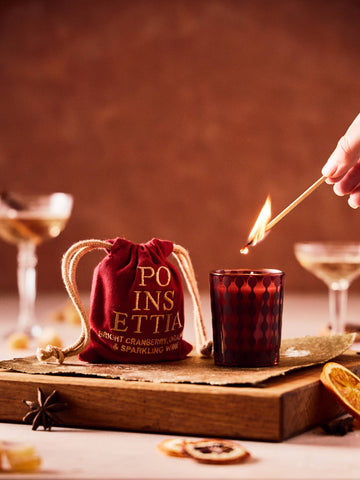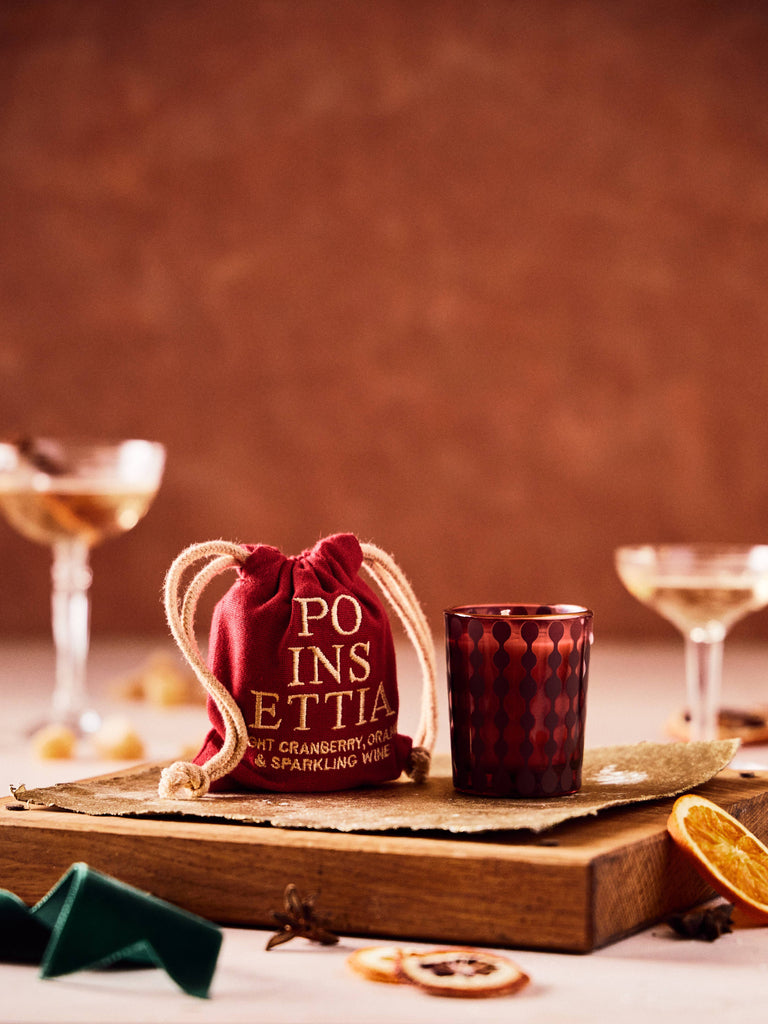 Sweetly refreshing, fruit-forward effervescence, and wrapped in Christmas red. Winter holiday parties are incomplete without a vibrant Poinsettia cocktail. Create new memories and share the merry with inviting aromas of bright cranberry, orange, and sparkling wine. Our 2.5oz candle comes in an embroidered bag.
