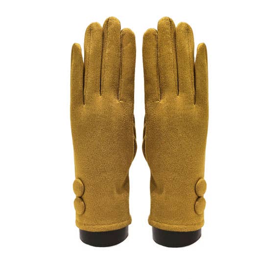 Suede feel solid color with 2 large buttons texting glove with touch screen and text friendly design.