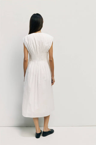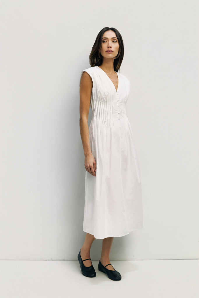 This pleated midi dress is crafted from midweight cotton poplin with a fully lined, sleeveless design, featuring a V-neck, pleated fitted waist, shoulder pleat detailing, midi length, and a partial front button closure.