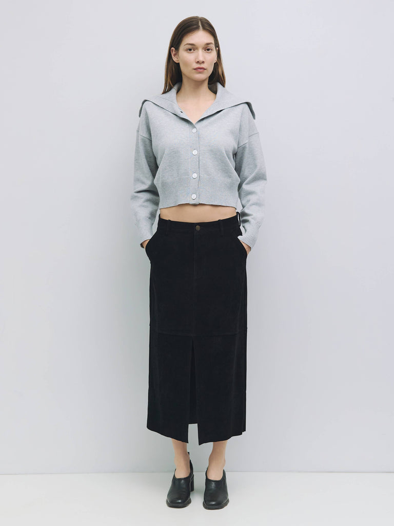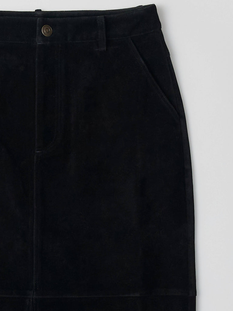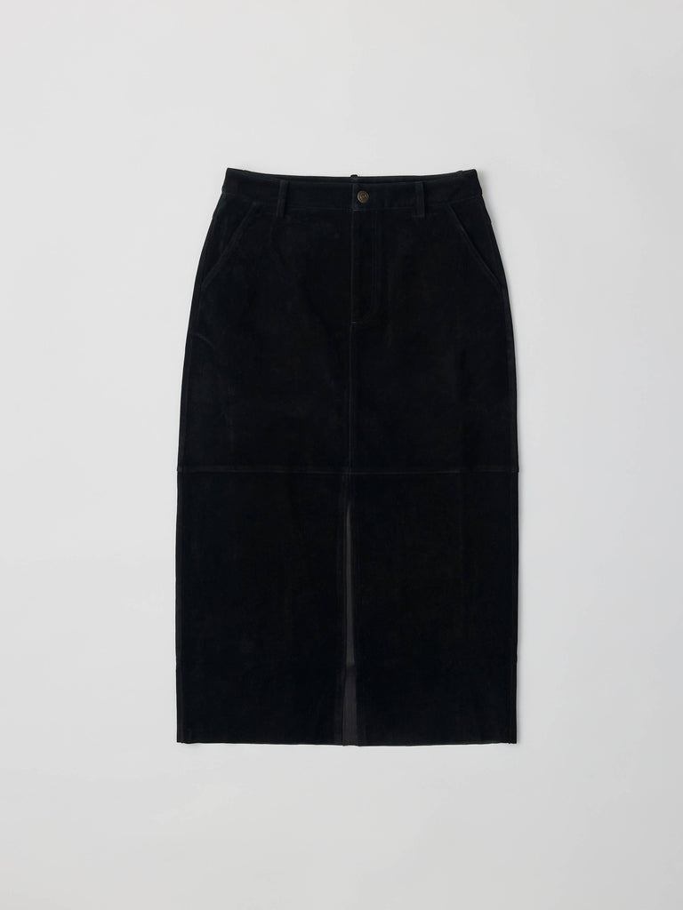 This faux suede midi skirt features a sleek H-line cut with a center front slit for a touch of edge. Side pockets add practicality, while the midi length makes it versatile for any occasion.