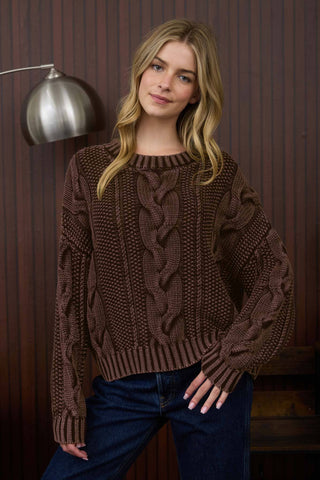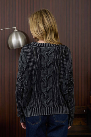 Washed cable knit pullover sweater in charcoal. Crew, round neckline. Long sleeves with a drop shoulder relaxed fit. Acid wash knit pattern tones may vary. Not lined.